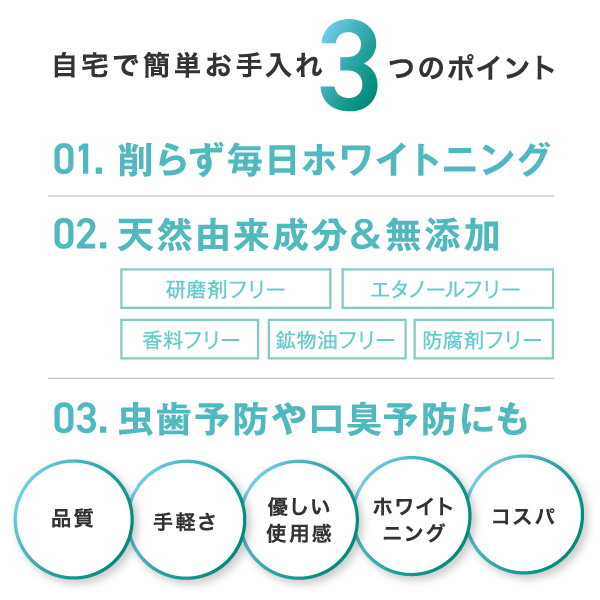キシリトール配合で虫歯の原因となるプラークを剥がれやすくしたり、泡が立たない分丁寧なブラッシングを高めることで口中を清潔に保ち口臭の予防にも。