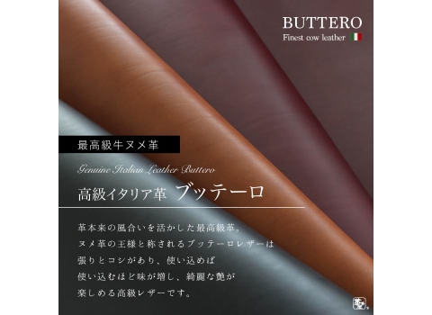 ヌメ革の王様と称されるブッテーロレザーは張りとコシがあり、使い込めば使い込むほど味が増し、綺麗な艶が楽しめる高級レザーです。