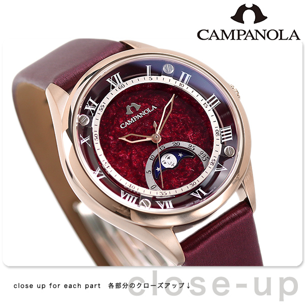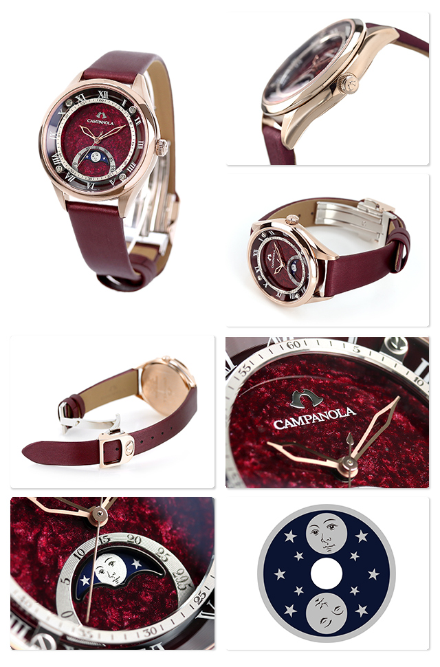 正規品 7年保証キャンペーン 送料無料 シチズン カンパノラ ムーンフェイズコレクション 燈寧 あかね 朱漆パール 日本製 クオーツ レディース 腕時計 EZ2002-01W CITIZEN CAMPANOLA MOONPHASE COLLECTION アナログ レッド 革ベルト ◆朱漆で地平線の空が明るく見える茜色の空を表現した「燈寧(あかね)」。朱色文字板は全面に艶のある朱色の漆にチタンを混ぜて、昼から夜へと移ろう一瞬に茜色に輝く空を表現しました。微笑むヴィーナスの顔と眠っているヴィーナスの顔が29.5日ごと(月齢の一ヶ月ごと)に変わり、月や宇宙の神秘性を感じさせます。ミドルサイズ35.5mmのケースを採用し、どなたの腕にもしっくりおさまる上品さとカンパノラらしい存在感のバランスがとれた仕上がりです。エレガントでモダンなサテン調素材を使用しています。 発売日:2022年2月発売