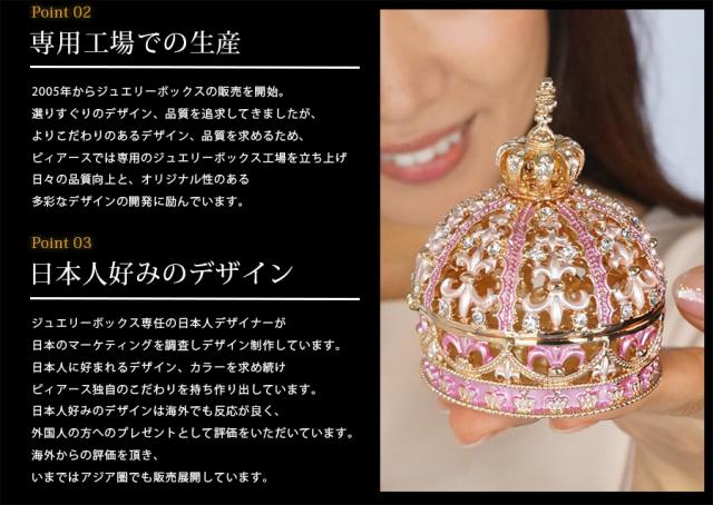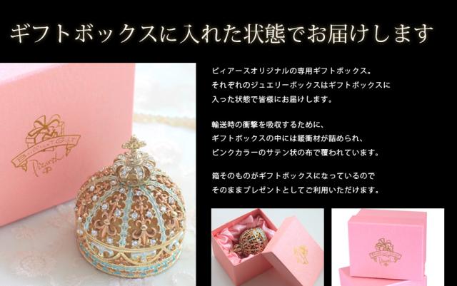 お子様から大人の方まで、幅広い年代の女性が一目惚れする、繊細で煌びやかな作りのジュエリーボックス。お誕生日や結婚祝いの贈り物など、心のこもったプレゼントとして多くの方から選ばれています。