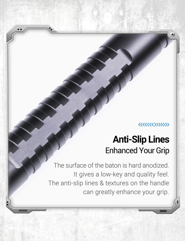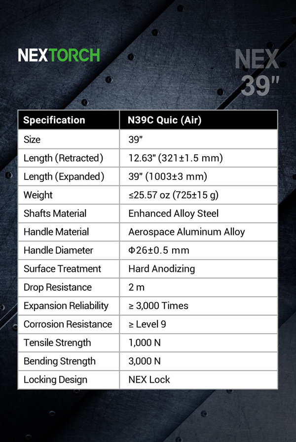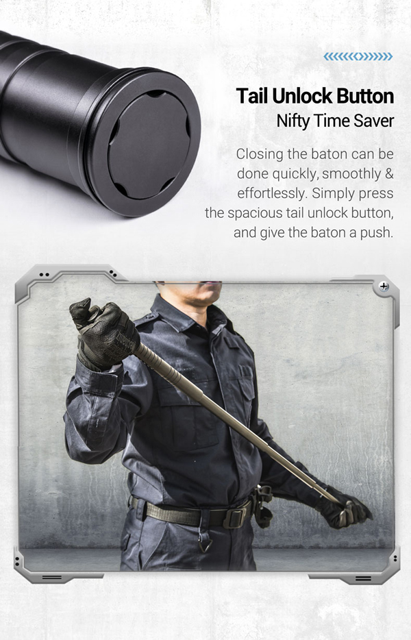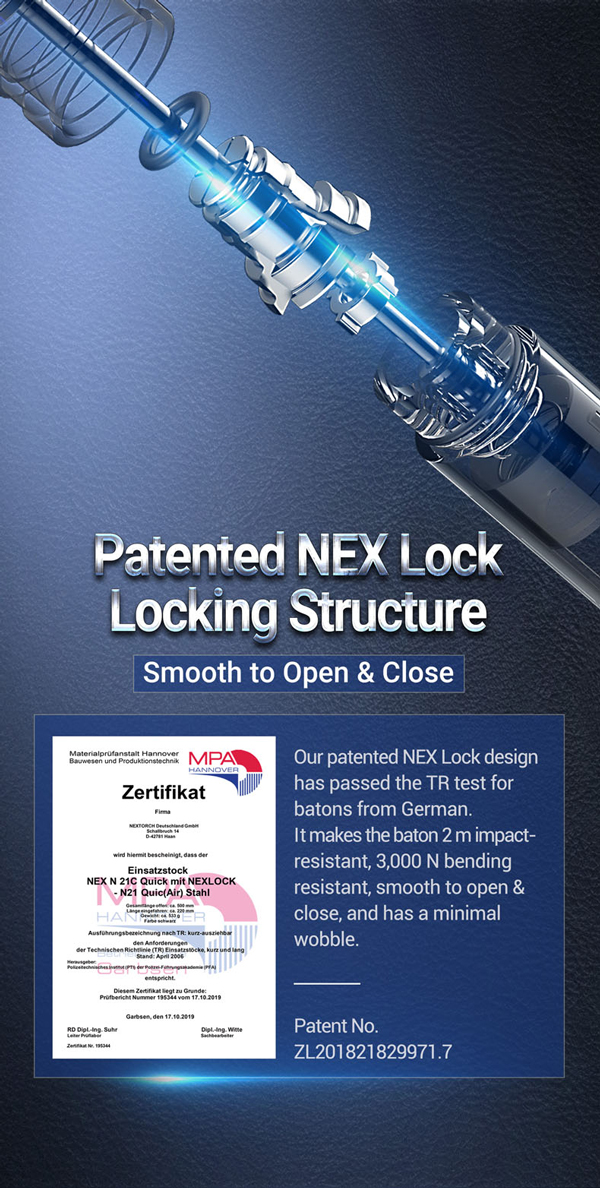 NEXTORCHのバトンには独自のロック機構(NexLock)が採用されています。殆どの中国メーカーがASPのTALONを真似てオートロックバトンを製作するのに対してNexLockは、他では見られないシンプルな構造でオートロックバトンを仕上げています。特許侵害に触れない為、欧米にも輸出が可能です。国際入札にもメジャーブランドと共に参加している数少ないオートロックバトンメーカーになります。クイッカーシリーズと4140鋼を使用したスチールバトンは警棒の試験では最も難しいと言われるTR試験にも合格しています。そのため世界の軍事市場でも人気があるバトンです。近年ではルーマニアやドイツ軍にも納入された実績があります。