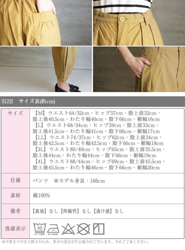 ■サイズ:【M】ウエスト64/32cm・ヒップ57cm・股上前32cm・股上後40.5cm・わたり幅40cm・股下66cm・裾幅16cm 【L】ウエスト68/34cm・ヒップ59cm・股上前33cm・股上後41.5cm・わたり幅41cm・股下66cm・裾幅17cm 【LL】ウエスト74/37cm・ヒップ62cm・股上前34cm・股上後42.5cm・わたり幅42.5cm・股下66cm・裾幅18cm 【3L】ウエスト80/40cm・ヒップ65cm・股上前35.5cm・股上後44cm・わたり幅44cm・股下66cm・裾幅19cm 【4L】ウエスト88/44cm・ヒップ69cm・股上前45.5cm・股上後45.5cm・わたり幅46cm・股下66cm・裾幅20cm