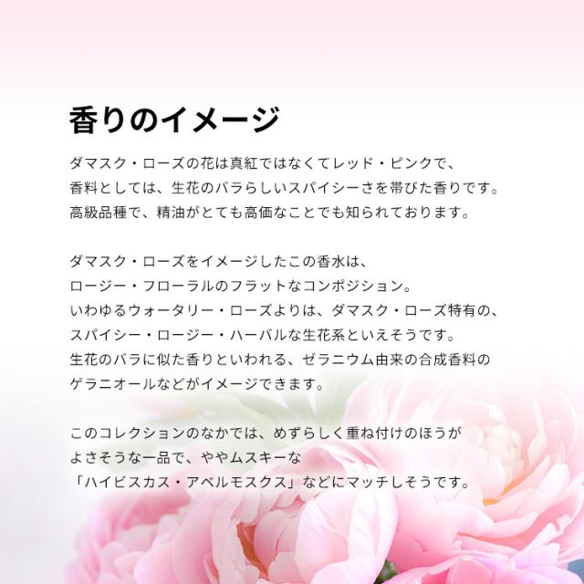 そんなダマスク・ローズをイメージしたこの香水は、ロージー・フローラルのフラットなコンポジション。