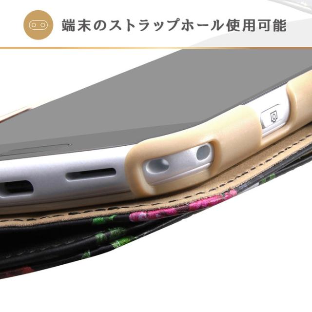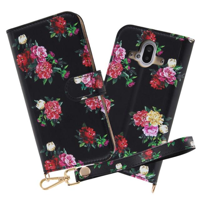 らくらくスマートフォン F 52B 手帳型ケース クリアポケット ハンドストラップ ルーペ付 花柄 ブラック 透明 カード収納
