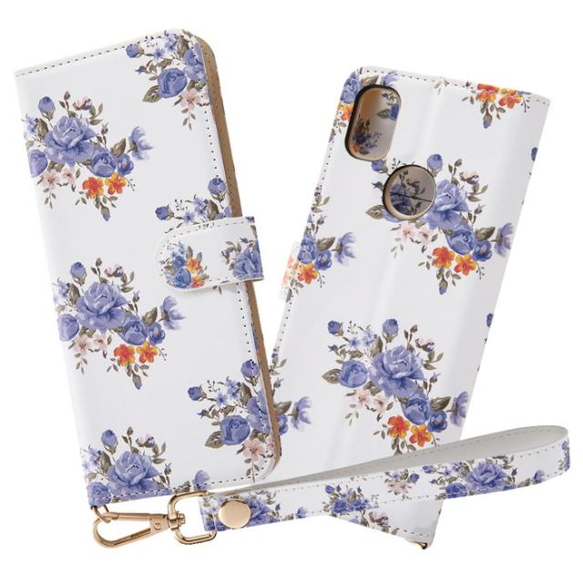 あんしんスマホ KY 51B 手帳型ケース クリアポケット ハンドストラップ ルーペ付 花柄 ブルー 透明 カード収納