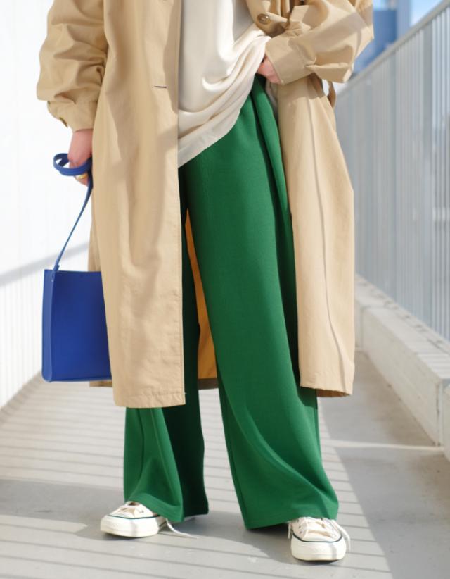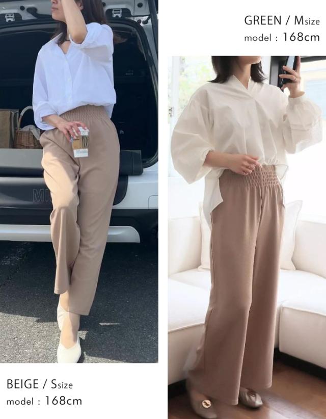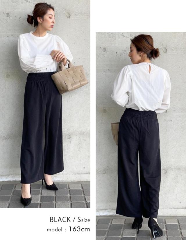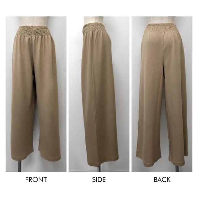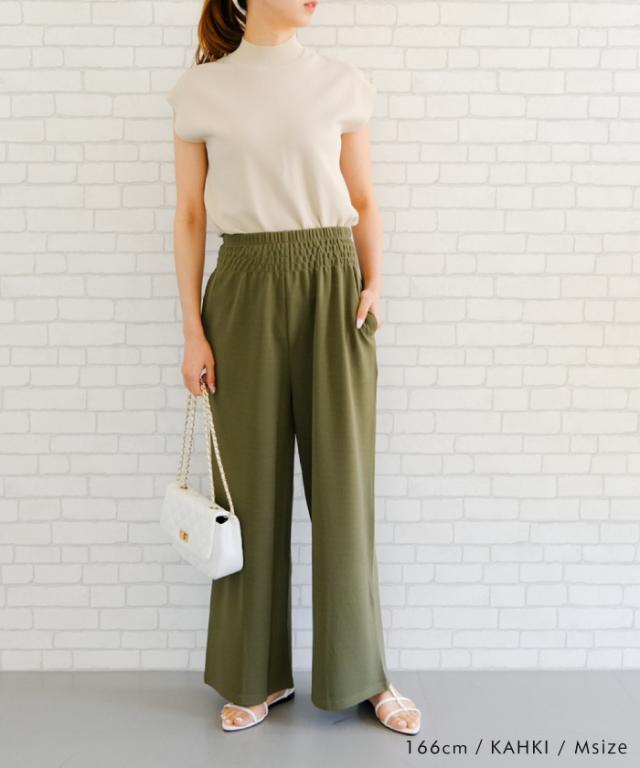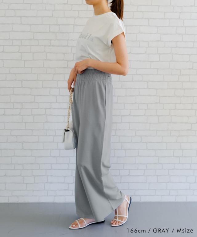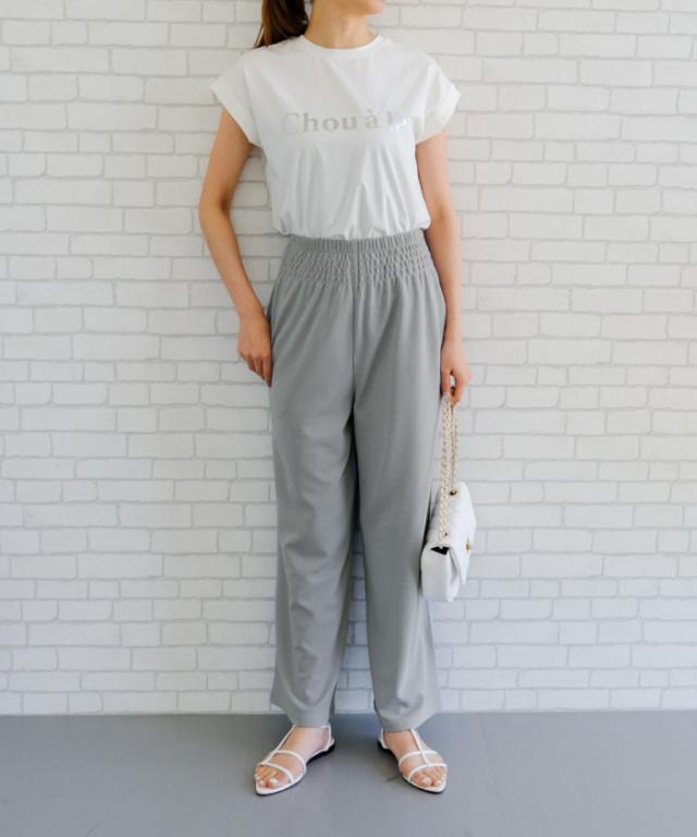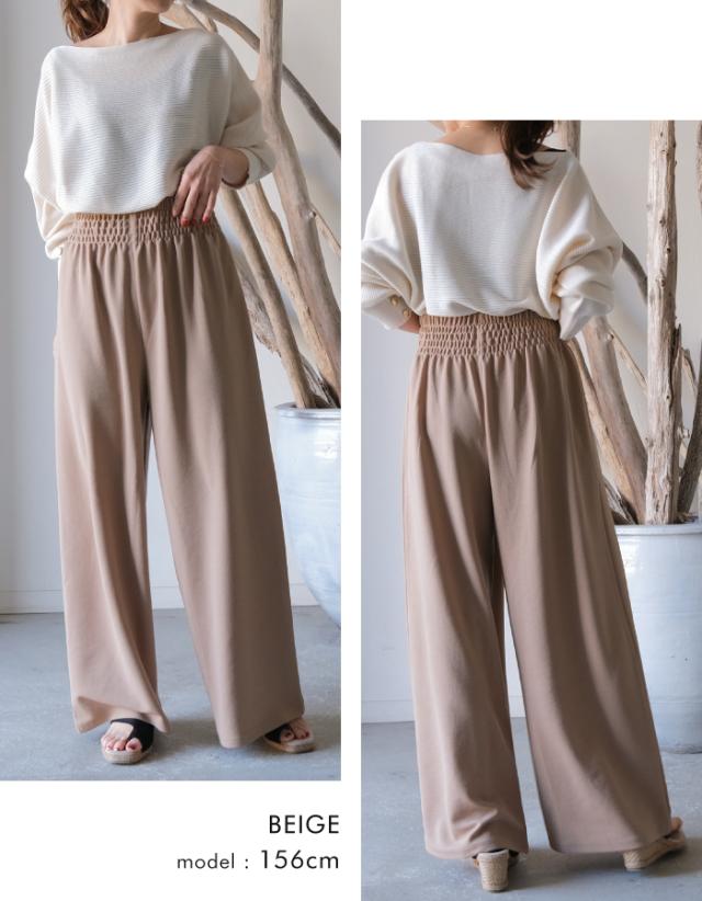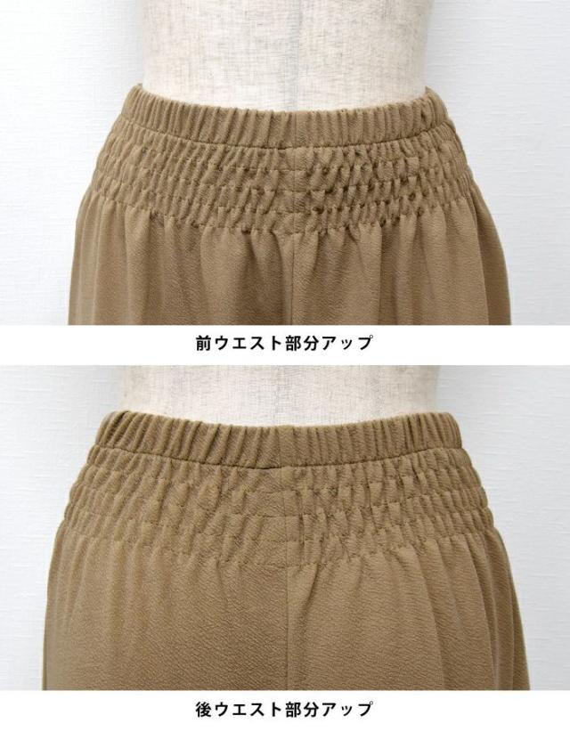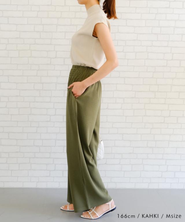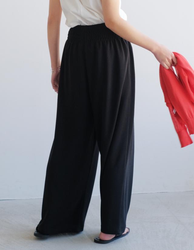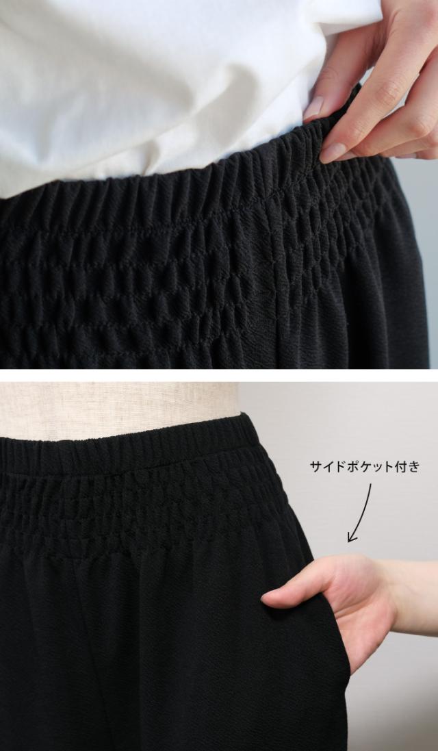 ウエストのシャーリングがワンポイントに。エンボス加工リラックスパンツ 。