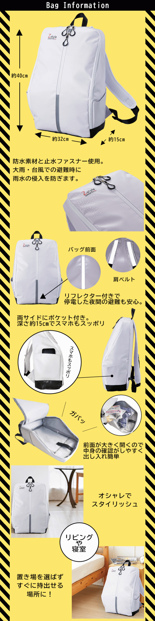セット内容:避難用リュックサック、ラジオ、伸縮2WAYライト、モバイルチャージャー