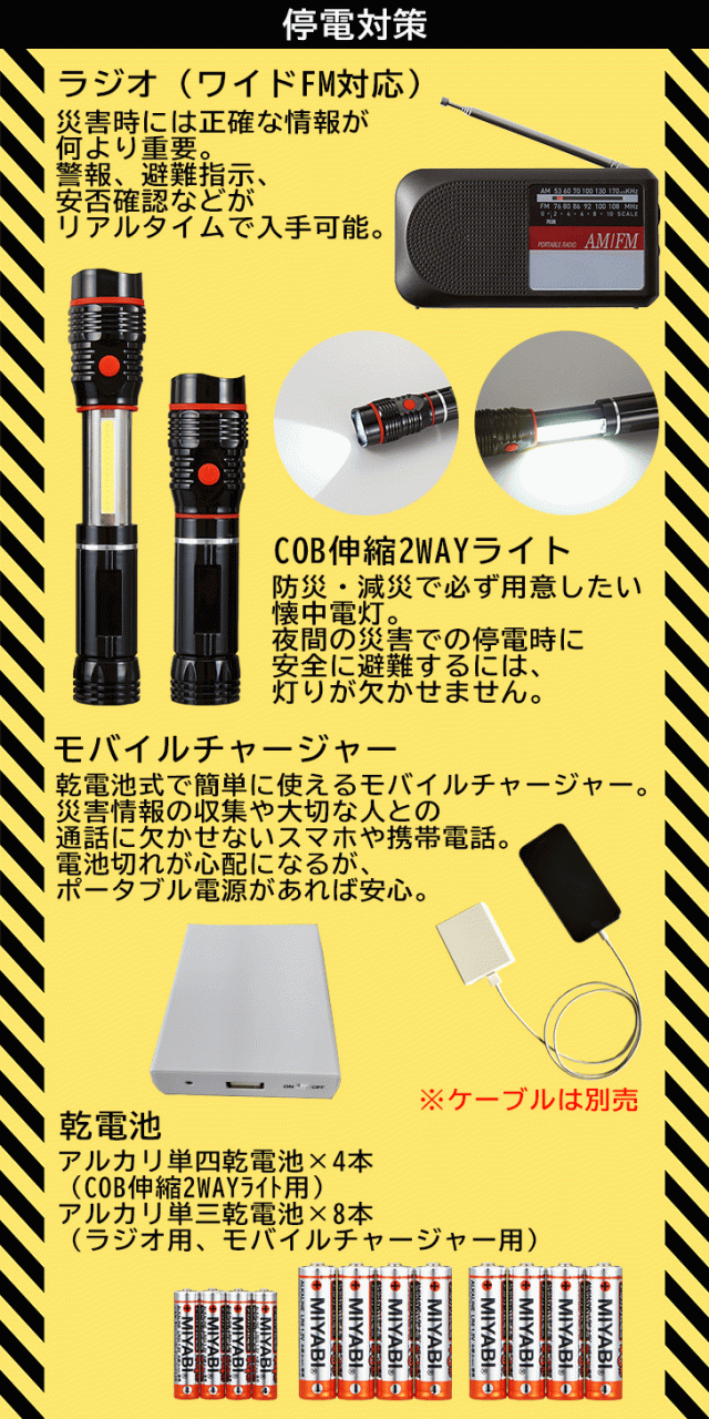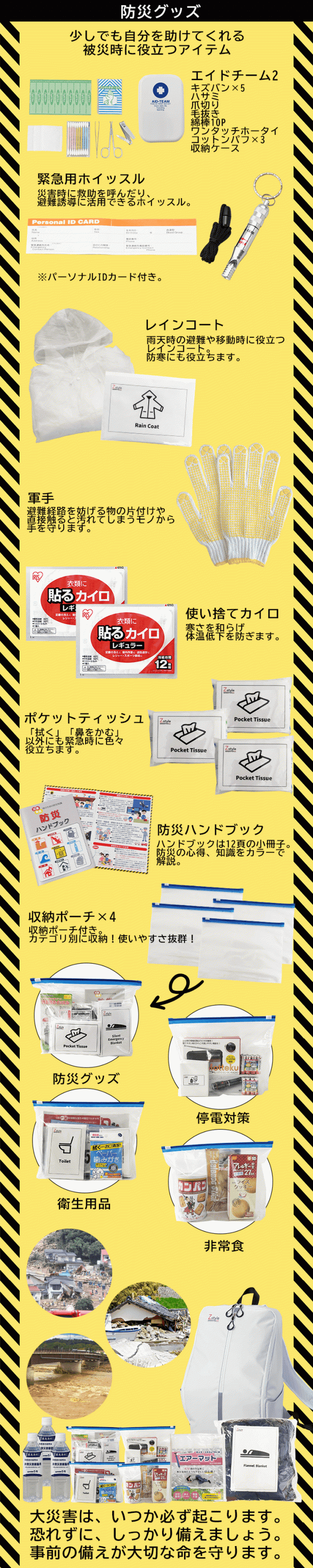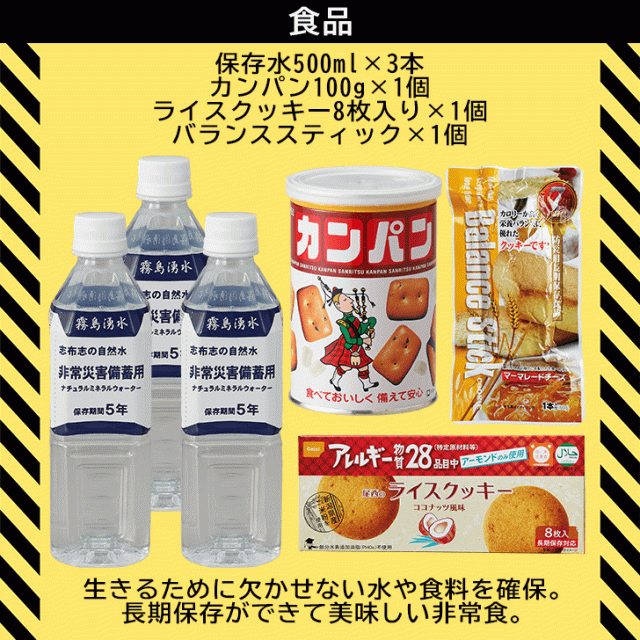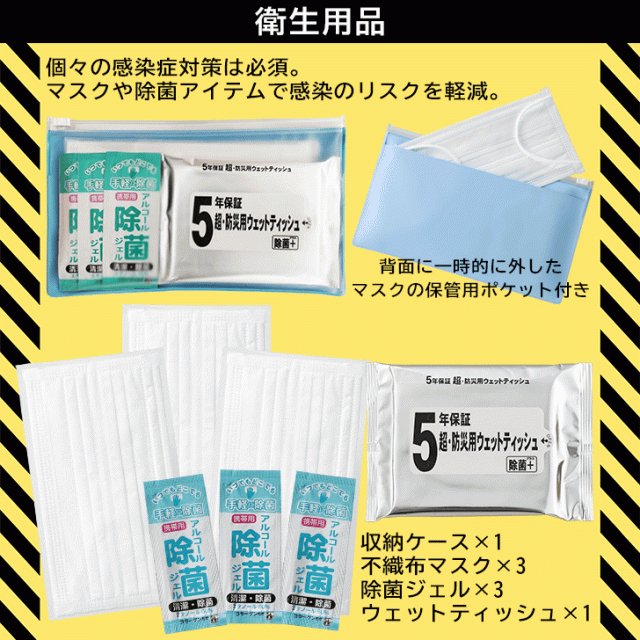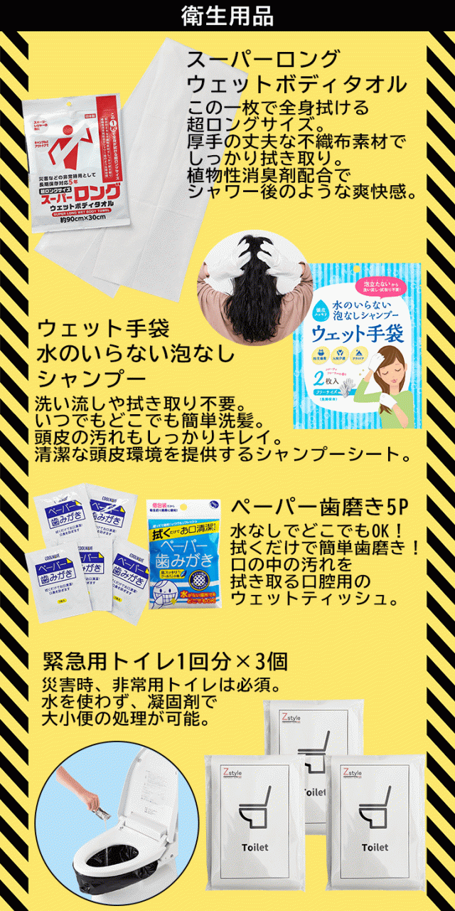 その他、ラジオやライト、モバイルチャージャーなどの防災グッズや、衛生用品、非常食などの役立つアイテムを幅広くセット