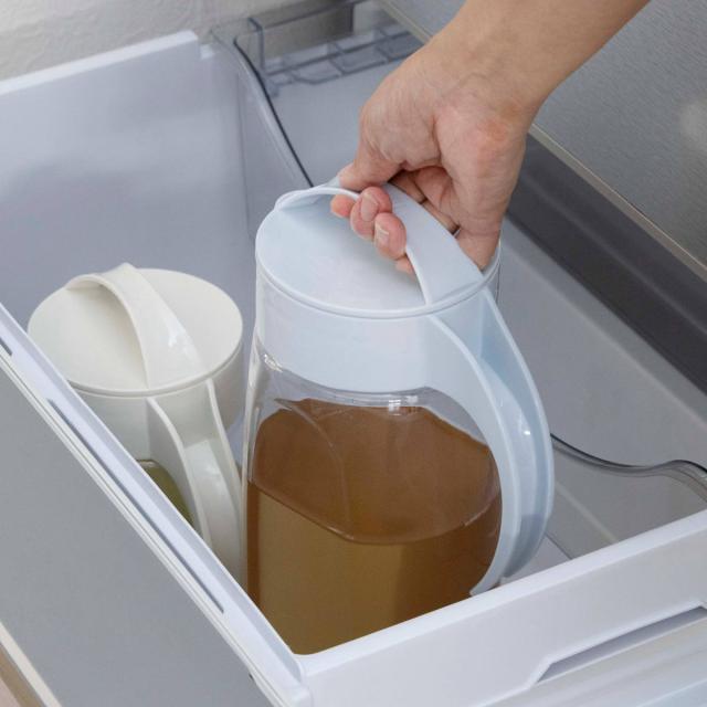 横置きで収納ができて冷蔵庫内の空いたスペースを有効活用でき、収納場所を選びません。大容量サイズなので、一度にお茶をたくさん作っておけばご家族みんなでお使いいただけます。飽きの来ないシンプルなデザインで機能性もバツグンです。