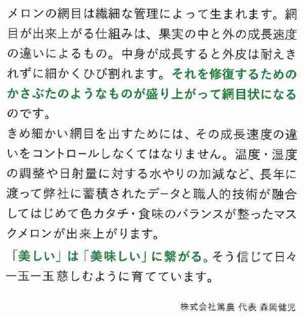 きめ細かい網目を出すためには、その成長速度の違いをコントロールしなくてはなりません。温度・湿度・CO2濃度調整や日射量に対する水やりの加減などなど、長年に渡って弊社に蓄積されたデータと職人的技術(これは理屈ではなく皮膚感覚に近いものだと思っています)が融合してはじめて色カタチ・食味のバランスが整ったマスクメロンが出来上がります。「美しい」は「美味しい」に繋がる。そう信じて日々一玉一玉慈しむように育てています。1玉約1.4kg前後 出荷まで多少お時間をいただく場合がございます。