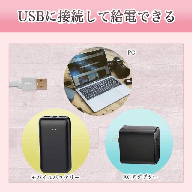 お手持ちのPCやUSB電源アダプター、またモバイルバッテリーを使用してどこでもお使いいただけます。
