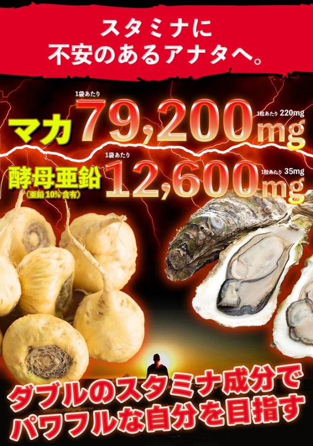 | 原材料名 | マカ末(国内製造)、酵母(亜鉛含有)、醗酵黒にんにく、クラチャイダム(黒生姜)、トンカットアリ末、マムシ末、すっぽん末、冬虫夏草菌系体末、ガラナ末/セルロース、ショ糖脂肪酸エステル、微粒二酸化ケイ素、L-シトルリン、L-アルギニン <主成分1袋あたり> ●マカ 79,200mg ●酵母亜鉛 12,600mg |