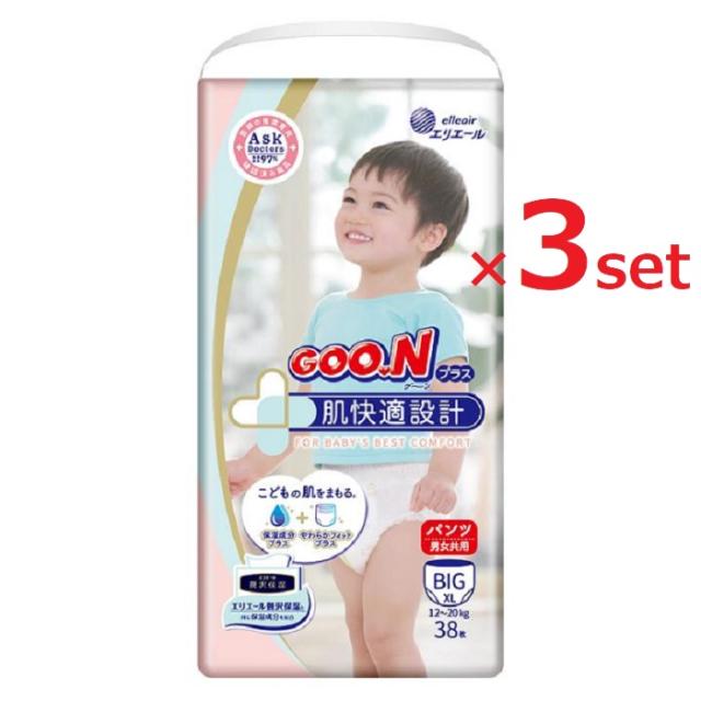 グーンプラス 肌快適設計 パンツ BIGサイズ 38枚入り グーン グーンプラス おむつ 紙オムツ むれない もれない 吸収性 保湿 エリエール GOO 3個セットN 人気 ランキング おすすめ