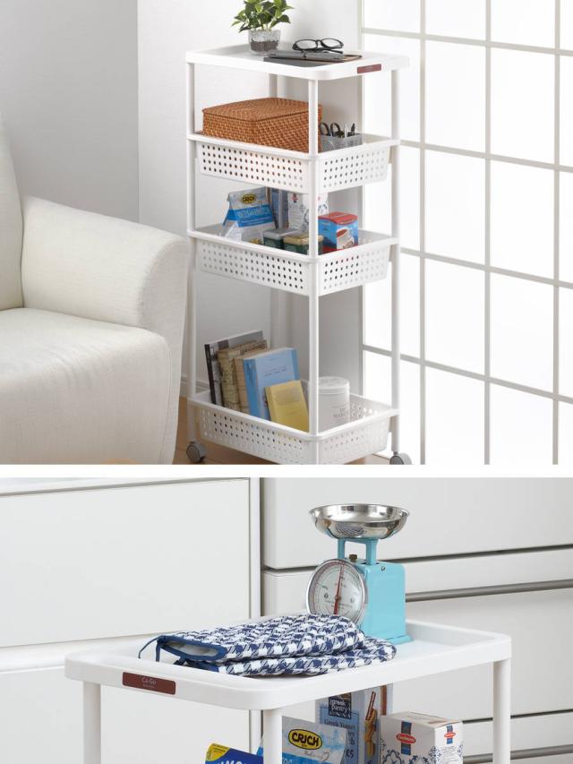 テーブルとしても活用できる上部のトレーは物を置いても落ちにくいフチ付きです。動かしても落ちる心配がなく、ティータイムの時にお菓子やティッシュなど必要な物を入れて、テーブル脇に置いておけば、後からキッチンに取りに行くこともなくなり便利です。