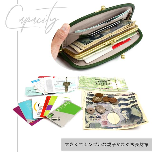 がま口を開くと中央に子がま口のある左右対称の構造になっています。カードポケットは8箇所で子がま口の両サイドにもカードが収納できます。サイドポケットも付いて横長のレシートやチケット、領収書などを分類して収納できます。フロントのフリーポケットにはすぐに使う鍵や駐車券などをしまうのに便利です。収納したものが落ちないように、スナップボタンが付いているのもうれしい。基本的な収納が備わっているため、スリムながらも使用感はスタンダードで持ちやすいのが特徴です。