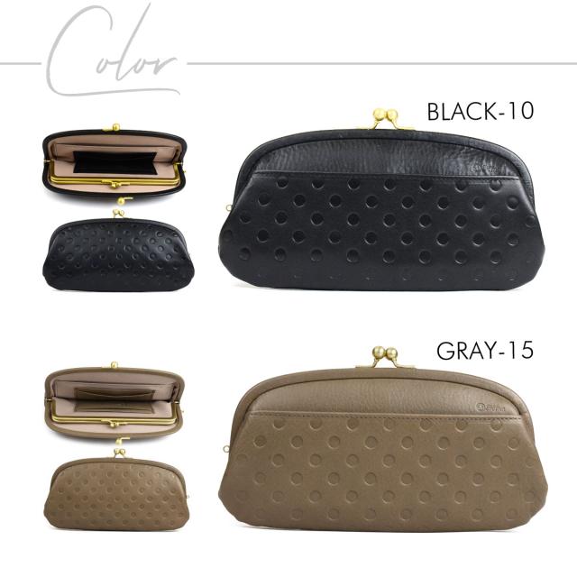 小さめのドットの型押しに革巻き口金を合わせたエレガントなデザイン。口金の金属部分に革をていねいに巻き付けることで、金属が主張しすぎず品のよい柔和な表情が生まれています。ドット柄は型押しで立体感があり、目で見て可愛いだけでなく、手で触れた時でも、凹凸による水玉の感触を感じられるのも魅力です。奇抜で目を引くというより、デイリーユースでも上質感とエレガントさを持ち合わせた大人の革小物です。