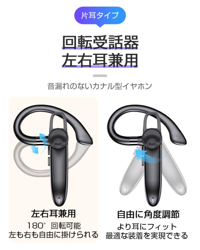 【片耳型/左右耳兼用】両耳イヤホンでは人の声やアナウンスに気づかなかったりしてしまいがちですが、片耳イヤホンなら周りの音を聞き逃してしまう心配もなし。ランニングやサイクリング中でも、音楽を楽しみつつ、周りの音も聞きながら走行できるので安全です。180°回転可能なレシーバーは、両耳に合わせて回転できる上に、お好みの角度に調整できます。