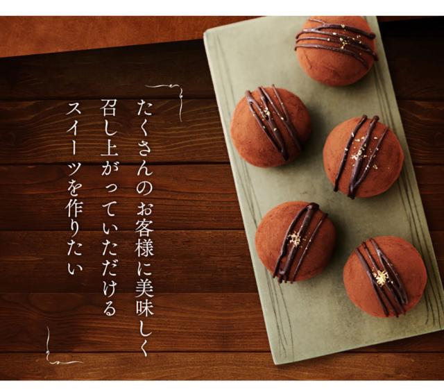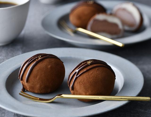 濃厚な生チョコを、国産もち粉を使った極薄の羽二重餅で包み込んだ「和製トリュフ」。柔らかに伸びる餅と口当たりのよいガナッシュの間に白あんを挟むことで、和洋が調和したまろやかな甘さになっている。ココアパウダーと金箔をまとった姿はギフトに◎。