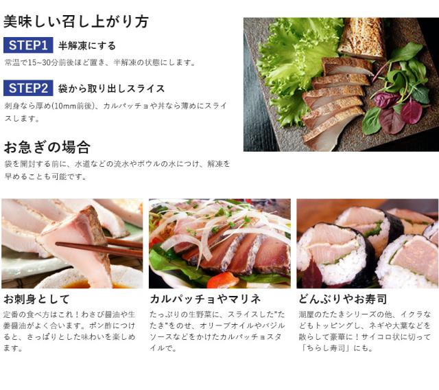 ○備考:常温、または流水にて半解凍にし、お好みの厚さでスライスし、ワサビ醤油、生姜醤油、ポン酢等の調味でお召し上がりください。カルパッチョ、海鮮丼の具材としても美味しく召し上がっていただけます。
