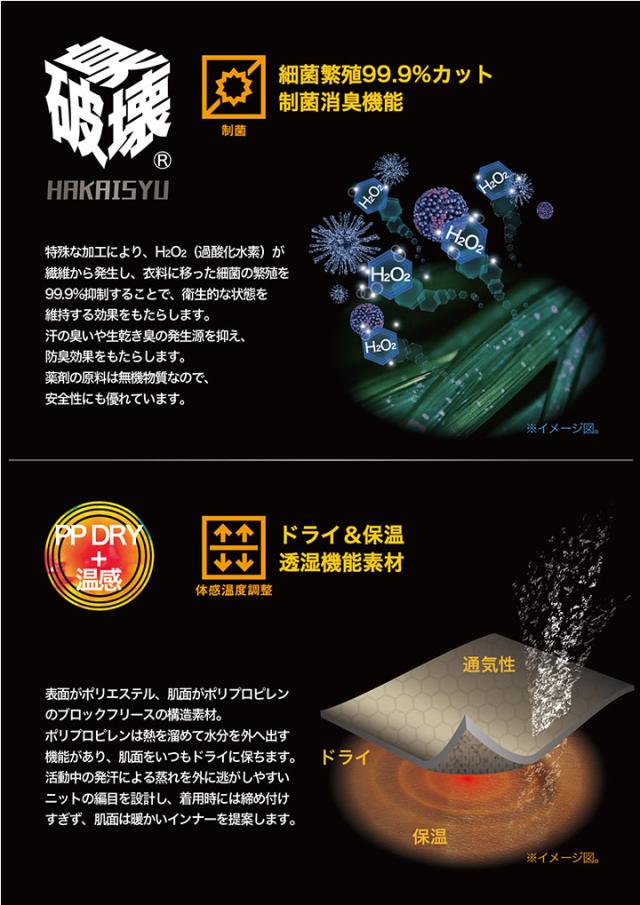 ・活動中の蒸れを外に逃がし、肌面はいつもドライに保ち締め付けが緩く暖かい着心地の良いインナー。