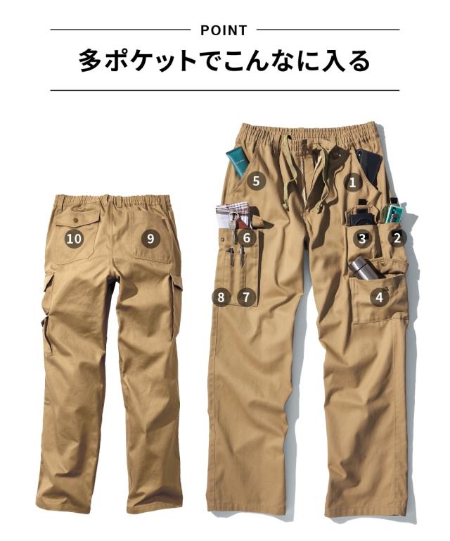 [keyword] メンズファッション 標準サイズ 普通サイズ 大きいサイズ ゆったりサイズ プラスサイズ フルレングス おしゃれ 綿100% 素材 [comment] シリーズ累計枚数32,000枚突破のオリジナル商品。ポケットが多いほど便利なボトムスに、大満足の10ポケット! 小物が落ちにくいワンタッチテープ付きやペン挿し用など、アイテムを整理しやすい収納力。 綿100%ではき心地も快適。お出かけはこれでキマリ! 大きいサイズも展開しております。(M/L/LL/3L/4L/5L/6L/8L/10Lサイズ) ■デザイン シリーズ累計32,000枚突破の人気シリーズ!これさえ着用すればカバンなしでおでかけ出来ます。 ウエスト総ゴム仕様で着心地抜群。 様々な形状のポケット付なので、用途に合わせて使えます。 トップスを選ばないカラー展開と、ストレートシルエットが特徴のカーゴパンツ ■素材 表生地は綿100%の綾織素材で肌にやさしいはき心地。 ■おすすめのおしゃれスタイリング カジュアルスタイルはもちろん、幅広くコーディネート出来ます。 ■おすすめの着用シーン 普段着 / 私服 / オンオフ兼用 / 通勤 / 通学 / 旅行 / 散歩 / オフ / お出かけ / ショッピング