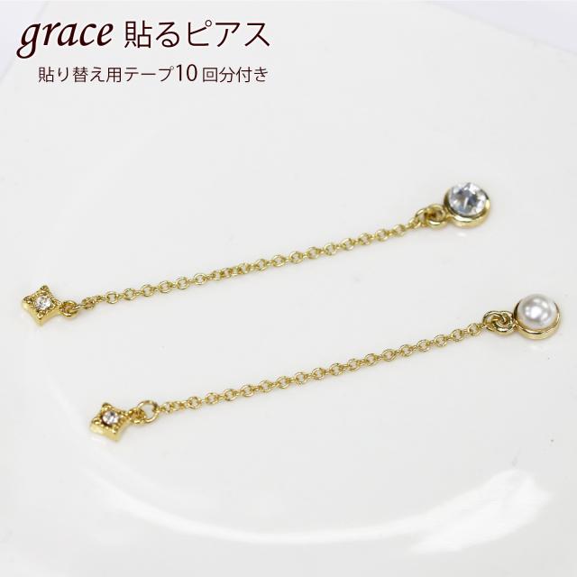 【grace貼るピアスとは?】専用テープで貼るだけ簡単ピアス! 穴が開いていなくても、金属アレルギーでも大丈夫。 痛みがなくおしゃれが楽しめます。grace貼るピアスのテープは安心の国内産医療用テープを採用しております。貼るピアスは専用テープがあれば繰り返しお使い頂けます。