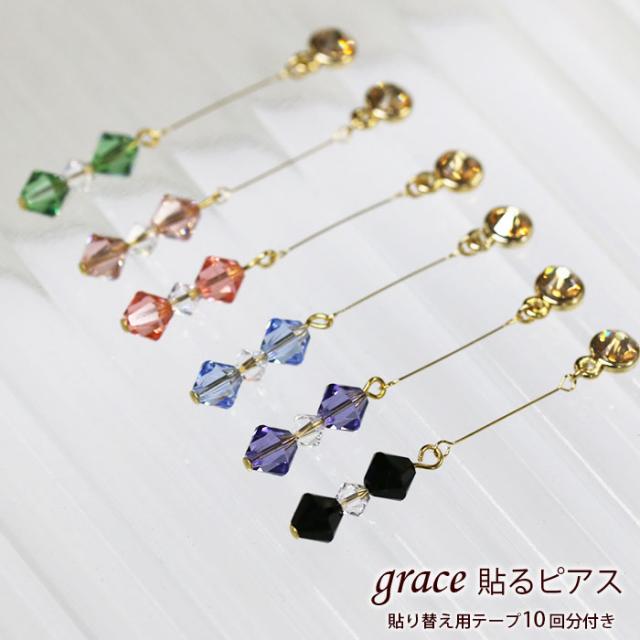 【grace貼るピアスとは?】専用テープで貼るだけ簡単ピアス! 穴が開いていなくても、金属アレルギーでも大丈夫。 痛みがなくおしゃれが楽しめます。grace貼るピアスのテープは安心の国内産医療用テープを採用しております。貼るピアスは専用テープがあれば繰り返しお使い頂けます。