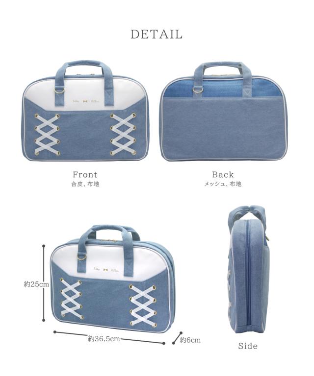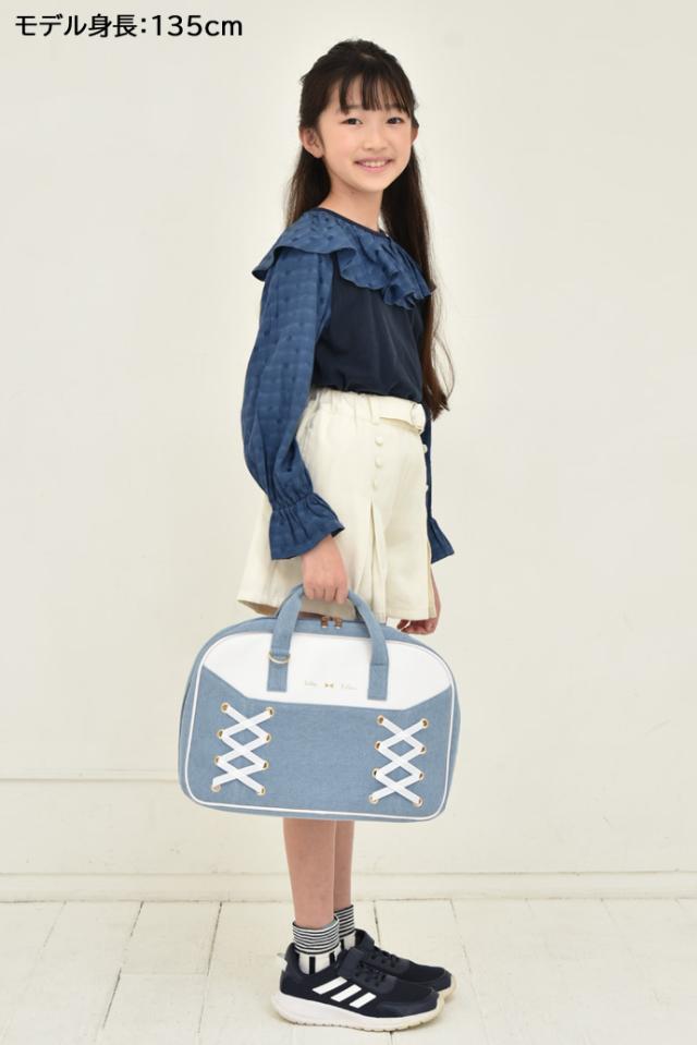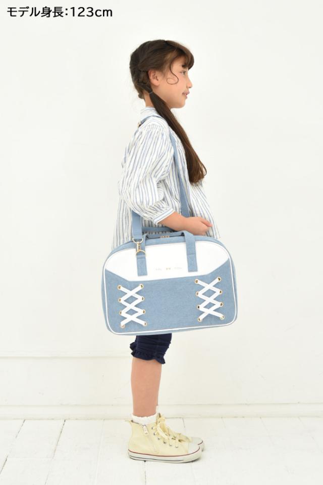 ◆デニム風のブルーのバッグに、白いリボンのレースアップがおしゃれなバッグです。