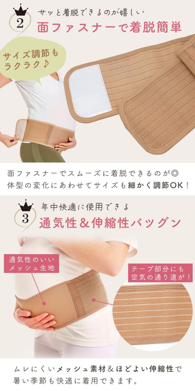 体型の変化にあわせてぴったりフィット。面ファスナーだからサイズ調整もらくらく、妊娠中でも手軽に着け外しできます。