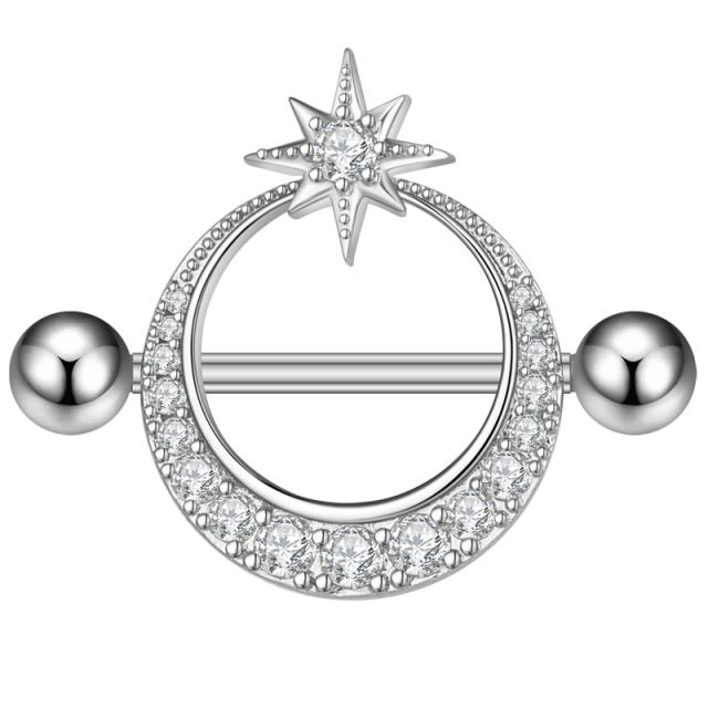 大きな星と付きをモチーフにしたシールドにクリスタルのキュービックジルコニアを散りばめ14ゲージのサージカルステンレス316L製のストレートバーベルのシャフトをセットした乳首用ニップルボディピアス。