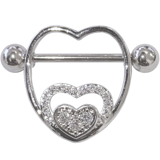 大きさの異なるハートのシールドにクリスタルのキュービックジルコニアを散りばめサージカルステンレス316L製の14ゲージのストレートバーベルのシャフトをセットした乳首用ニップルボディピアス。