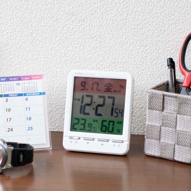 表示される内容を3色に色分けし、画面で情報を瞬時に見分けられる工夫が施された置き時計です。コンパクトなサイズ感なので、置き場所が限られた場所やベッドサイドにもピッタリです。温度・湿度のバランスをチェックすることもでき、室内環境を整える目安となるので、赤ちゃんや高齢者、ペットなどがいて室内環境に注意したいご家庭におすすめです。