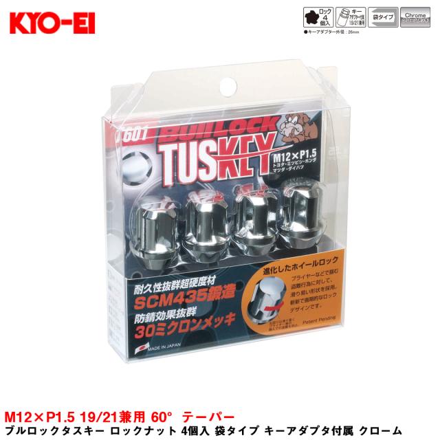 KYO-EI ブルロックタスキー ロックナット 4個入 袋タイプ キーアダプタ付属 クローム M12×P1.5 19/21兼用 60°テーパー トヨタ車等 T601