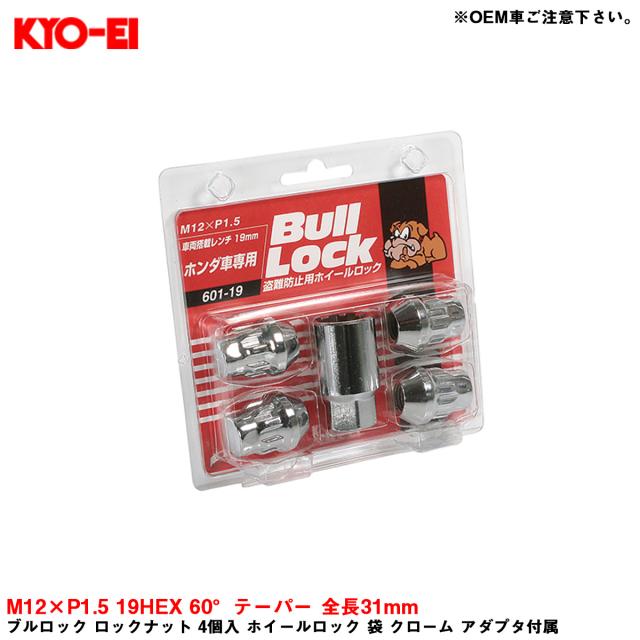 KYO-EI ブルロック ロックナット 4個入 ホイールロック 袋 クローム アダプタ付属 M12×P1.5 19HEX 60°テーパー 全長31mm 601-19