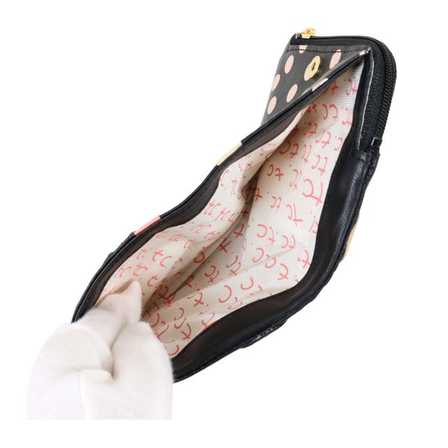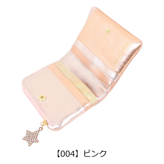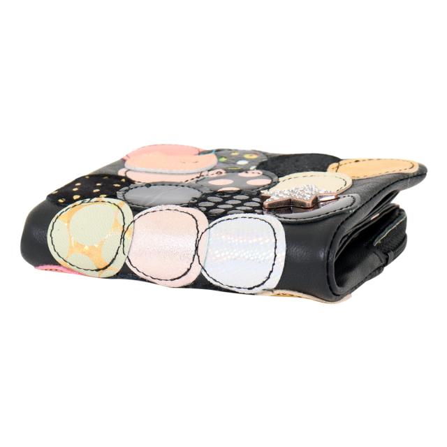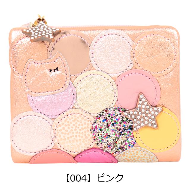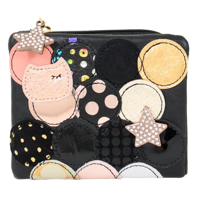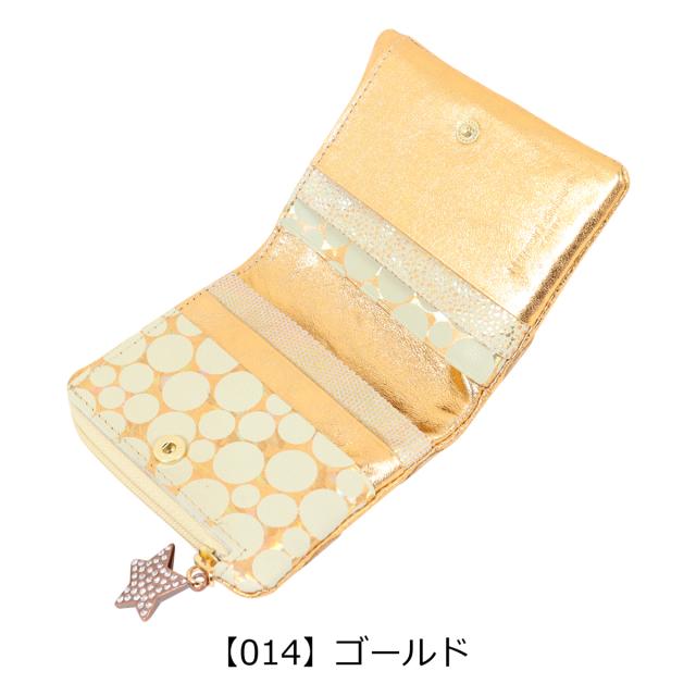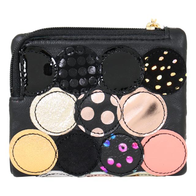 エナメル・ドットプリント等様々な素材の革を丸い型でパッチワークした「新マルチドット」シリーズの二つ折り財布です。星型チャームがとってもキュート。敷き詰められたユニークでかわいいドットにラメの星飾りがとってもキュート。可愛くガーリーなアイテムなのでファッショナブルに組み合わせができます。