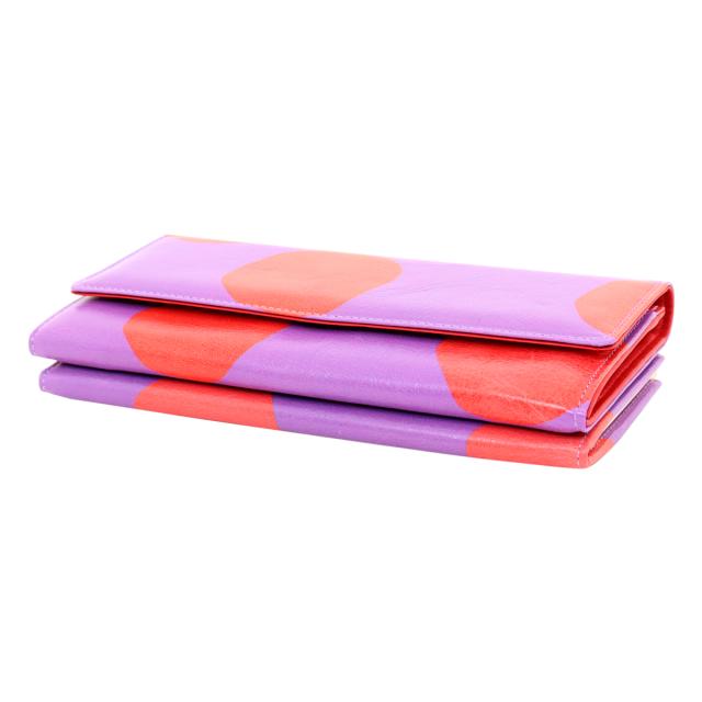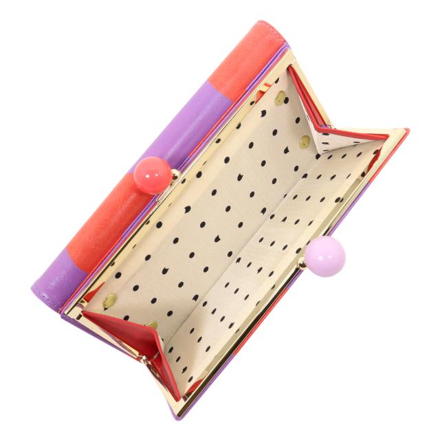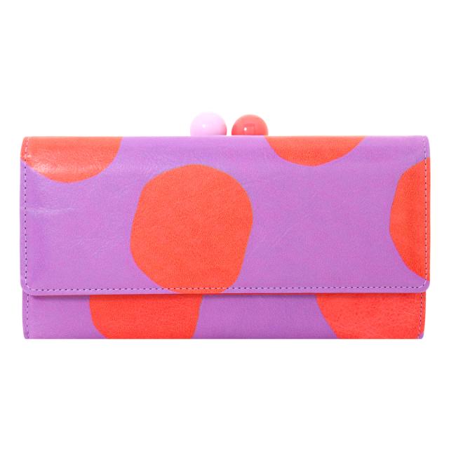 キップ革に手書き風の大きなドット柄がプリントされたがま口長財布です。キップ革は肌目が細かいので発色が良い。がま口のぽっちがバイカラーになっているのも可愛いポイントです。