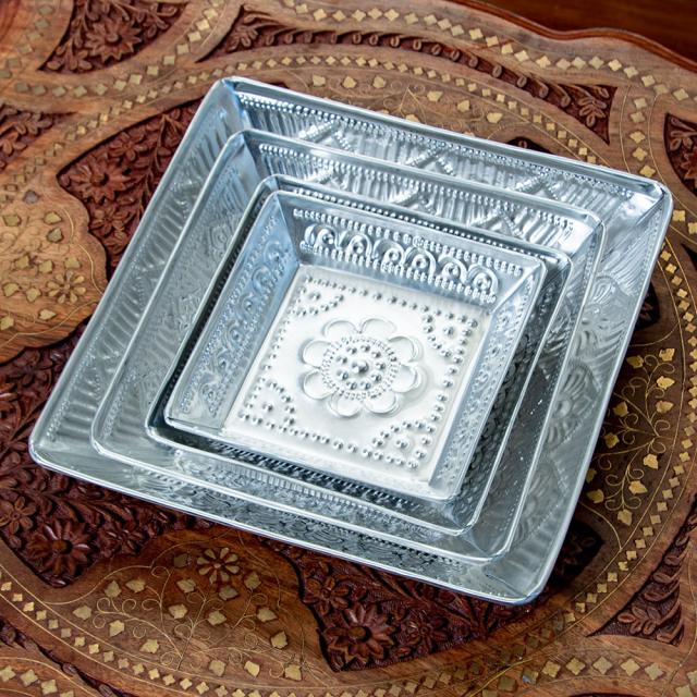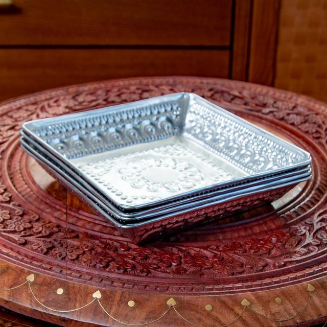 バリのアルミスクエアトレイ 手打ち細工が美しい - 15.5cm x 15.5cm / 飾り皿、皿、小物入れ、アルミ皿、おぼん、お盆、トレー、ハンドメイド、バリ雑貨、バリのアルミ雑貨 インド アジアの食材 【インドとアジアン食品・食材