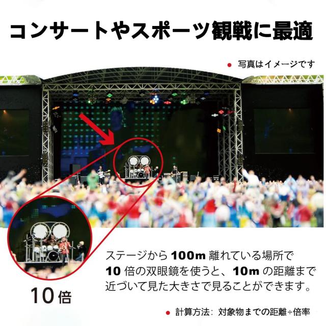 【高透過率のレンズ採用】光学倍率をコンサートシーンで使える10倍を維持したまま、光の透過率をできるだけ上げることのできるレンズを採用。薄暗い場所でも明快なブルーレイ画質を見える可能。10倍の倍率で、100m先の人を裸眼で10m先から見るのと同じ大きさで見えます。目の前に臨場感を見逃さないように。