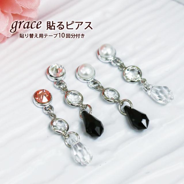【grace貼るピアスとは?】専用テープで貼るだけ簡単ピアス! 穴が開いていなくても、金属アレルギーでも大丈夫。 痛みがなくおしゃれが楽しめます。grace貼るピアスのテープは安心の国内産医療用テープを採用しております。貼るピアスは専用テープがあれば繰り返しお使い頂けます。