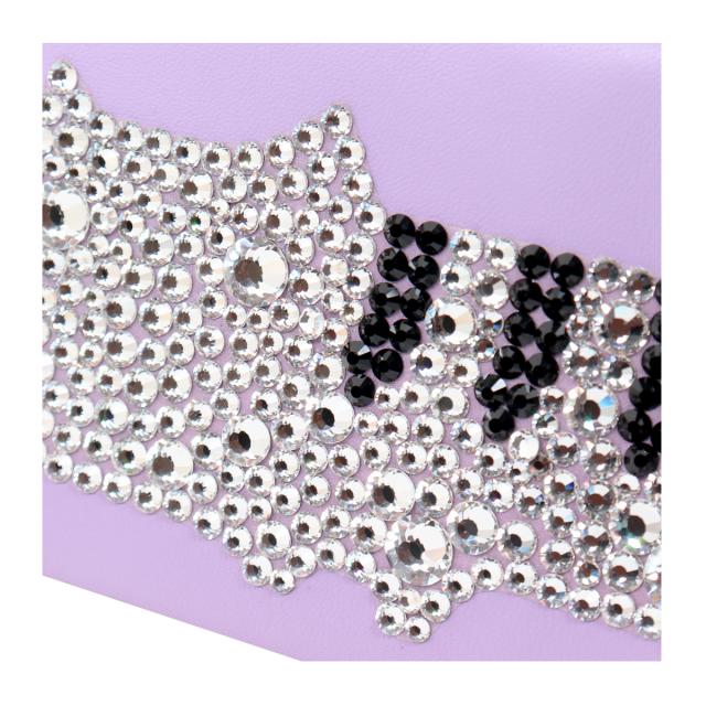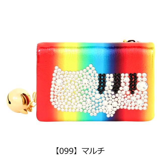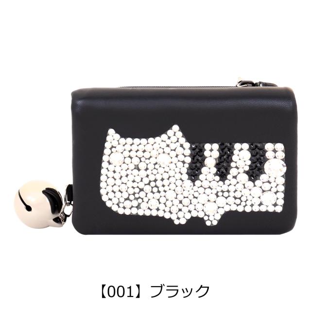 それぞれの革にぎっしりとクリスタルストーンでかたどったネコのシルエットが可愛い二つ折り財布です。小さいサイズはネコの全身のシルエットがパズルのようになっています。チャームがネコの鈴でワンポイントアクセントになっており猫好きにはたまらないアイテムです。