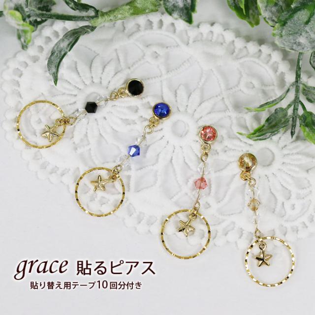 【grace貼るピアスとは?】専用テープで貼るだけ簡単ピアス! 穴が開いていなくても、金属アレルギーでも大丈夫。 痛みがなくおしゃれが楽しめます。grace貼るピアスのテープは安心の国内産医療用テープを採用しております。貼るピアスは専用テープがあれば繰り返しお使い頂けます。
