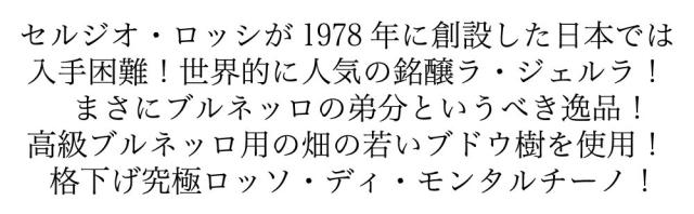 セルジオ・ロッシが1978年に創設した日本では入手困難!世界的に人気の銘醸ラ・ジェルラ! まさにブルネッロの弟分というべき逸品!高級ブルネッロ用の畑の若いブドウ樹を使用! 格下げ究極ロッソ・ディ・モンタルチーノ!■さまざまなギフトアイテムをご用意しております。お中元 ギフト 御中元 お盆 お礼 敬老の日 クリスマス 冬ギフト お歳暮 御歳暮 お年賀 御年賀 お正月 年末年始 ご挨拶 バレンタイン ホワイトデー お返し 父の日 母の日 ギフト 贈答品 お土産 手土産 御祝 御礼 内祝い 引き出物 お祝い 結婚祝い 結婚内祝い 出産祝い 出産内祝い 引き菓子 快気祝い 快気内祝い 進学祝い 誕生日祝い バースデーケーキ プレゼント Wedding ウェディング ホームパーティ お花見 パーティ 退職ギフト 退職 就任祝い