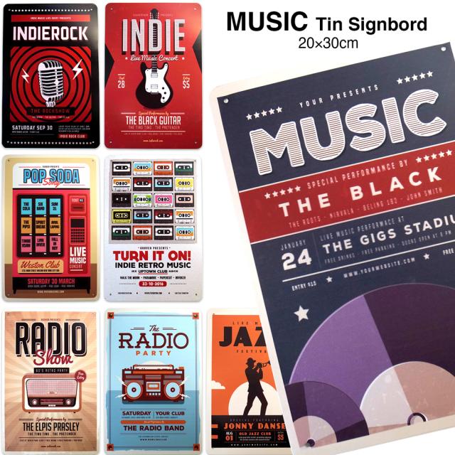 SALE MUSIC ブリキ看板 20cm×30cm インディーロック ジャズ ジュークボックス テープ ラジオ ギター マイク レコード Rock Hiphop R&B JAZZ
