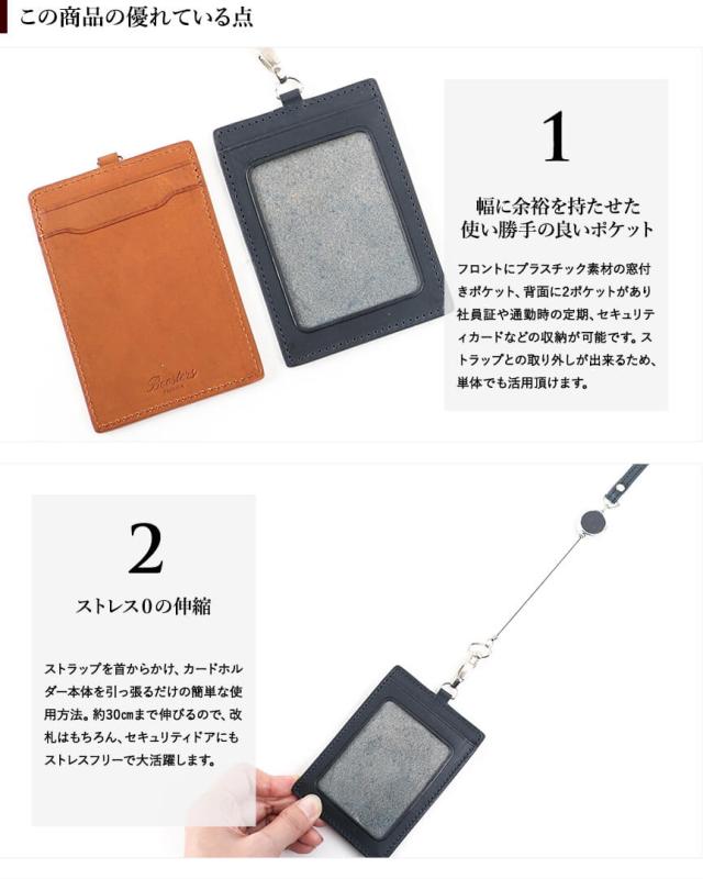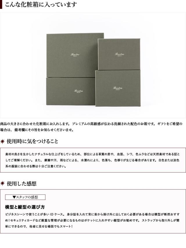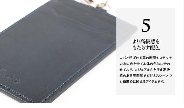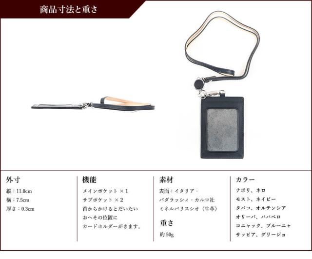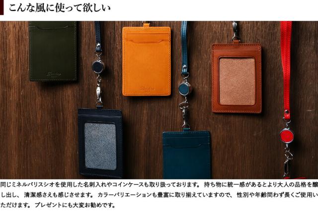 - 縦型の革製IDホルダーを探しており、価格・名入れ出来る・ストラップの肌面は染無しという点に惹かれてこちらの「ミネルバリスシオ コニャック」を購入しました。しっとりした革の風合い、色味、ストラップの細さ、カードの出し入れの容易さ(しかしガバガバではない)、軽さ、想像以上で完璧です! 配送も迅速、名入れ商品にも関わらず注文から2日後に届き驚きました。梱包も化粧箱入りでとても丁寧。仕事で毎日使うので良いものを買えて大満足です。