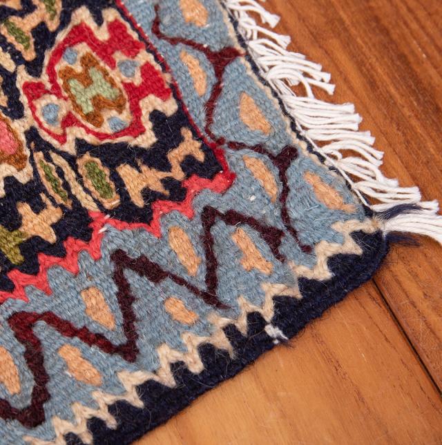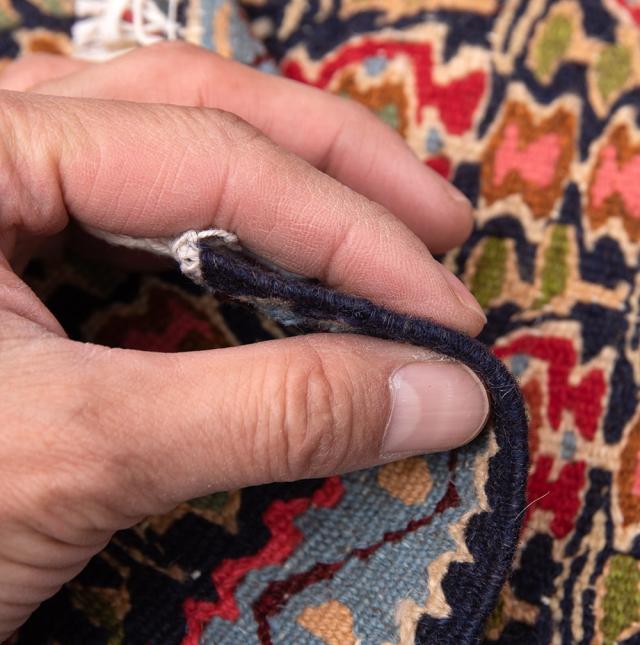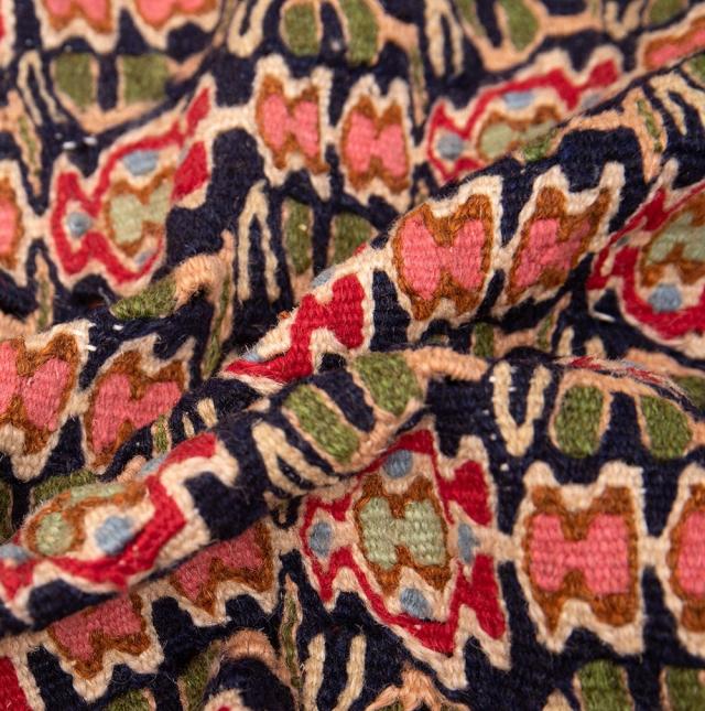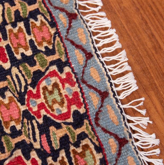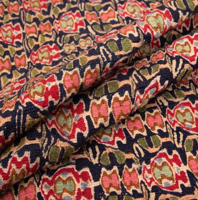 曲線織りで織られているキリムです。通常の織物は経糸と緯糸を交互に交差させて織りますが、こちらの曲線織りでは、経糸を上下にずらして、その間に別の糸を差し込むようにして織られています。経糸をずらしますので、曲がったようになり、デザインに曲線部分ができます。細かい模様を入れ込めるので、熟練した織手になると、大変美しい模様を描き出します。