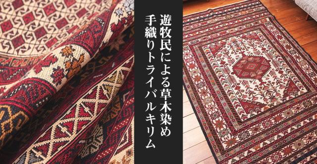 ここ最近流行しているキリム。キリムとは遊牧民達が織る平織りの敷物のことを指します。キリムの魅力は絨毯に比べると手頃な価格と、遊牧民のセンスがあふれる独得の幾何学模様、色やデザインです。日本に輸入されているキリムはイランからのものが多いのですが、こちらのキリムは色々な国を旅し、その中でも一番トライバルで魅力的だと感じたカル・ムハマディ族のトライバルキリムです。遊牧民には数多くの部族がいて、その部族ごとに織られるモチーフやパターンが違います。