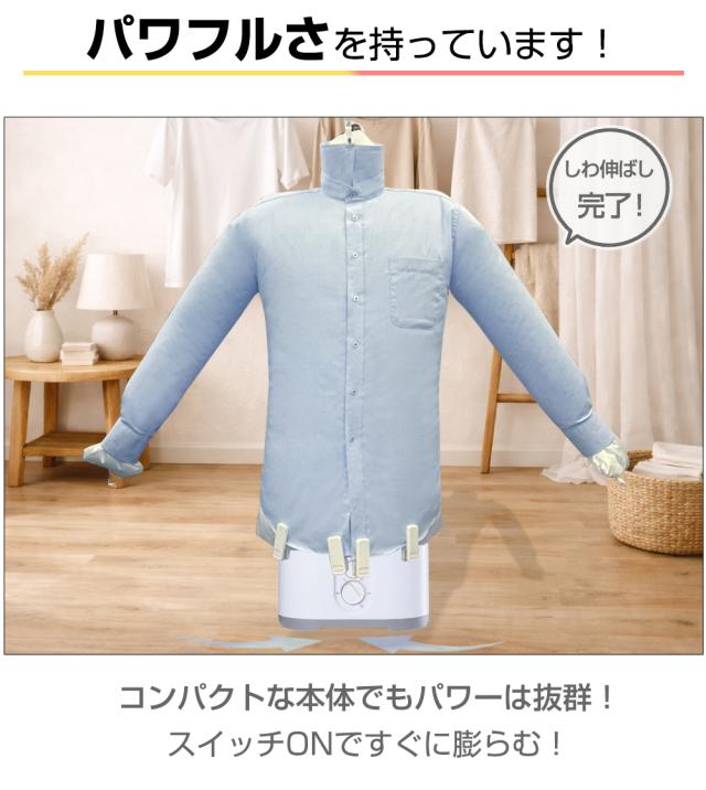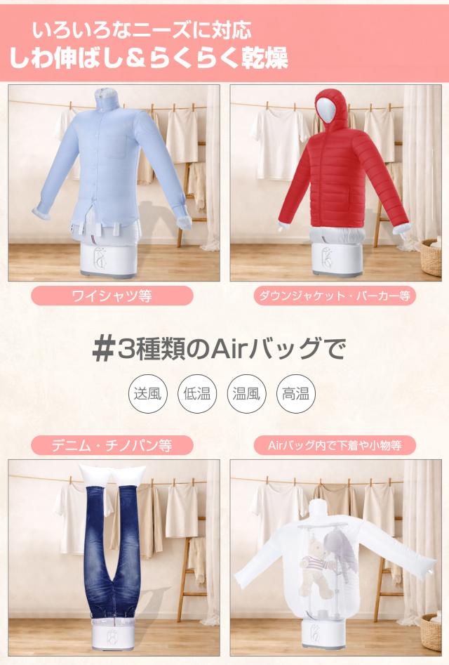 アイロン不要!付属のエアバッグと空気の力でしわ伸ばし!トップス、ボトムスのエアバッグ付属。布団乾燥機としてもパワフル温風 新生活 家電 便利グッズ 応援 一人暮らし 必要なもの