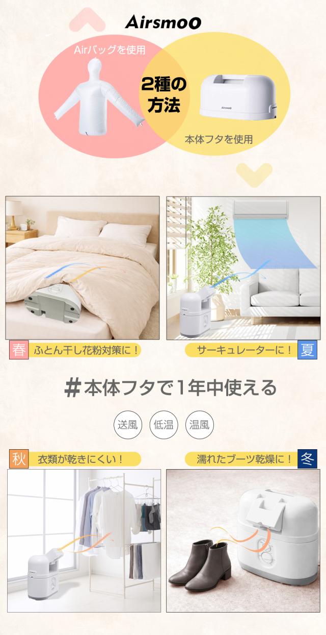 \ポイント20%還元中/衣類乾燥機&ふとん乾燥機 アイロン不要 エアバッグで かんたんしわ取り お布団にも!Airsmoo-04F (エアスムー) コンパクト 部屋干し 温風乾燥 小型 デカ暖 洗濯 靴乾燥 ブーツ 3Dアイロン フルセット 一人暮らし 省エネ 節約 新生活 新社会人