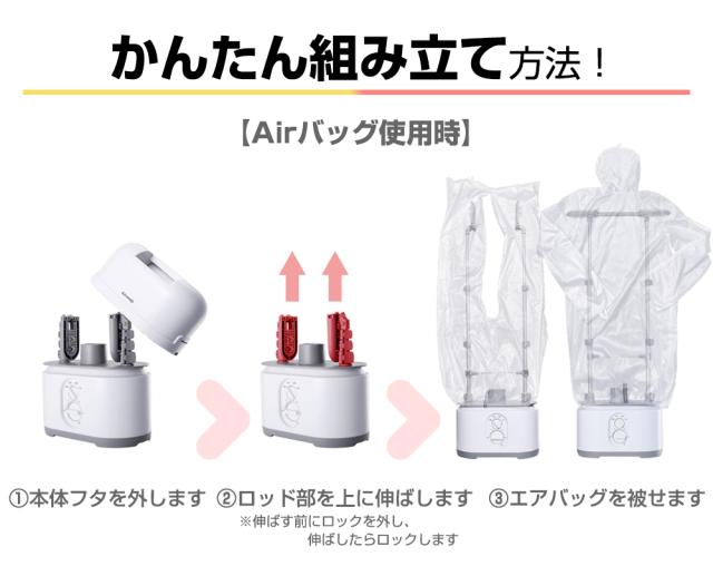 | セット内容 | 本体、本体用フタ、蒸気ガード、重り付きクリップ×4、襟止めクリップ、MサイズAirバッグ、L(XL)サイズAirバッグ、ボトムスAirバッグ ※蒸気ガードは本体フタ内部に付属 / 重り付きクリップと襟止めクリップは背面収納に付属 |