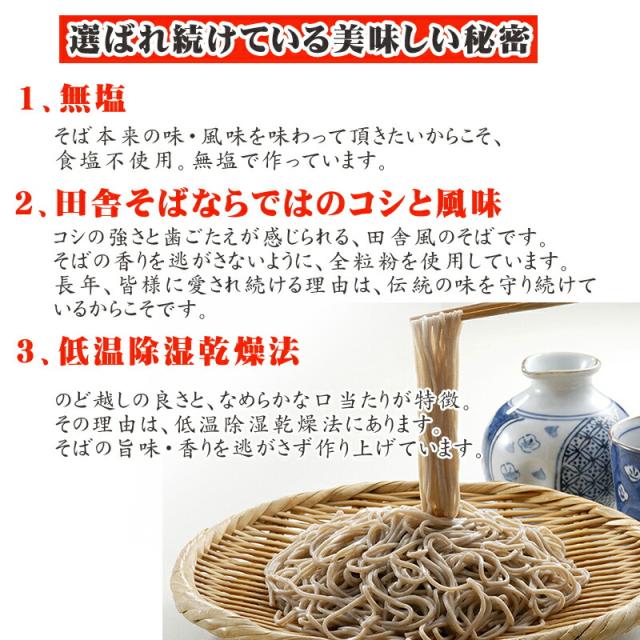 田舎そばならではのコシの強さが自慢。そばの香りを逃がさないように全粒粉を使用。食塩不使用なので、そば本来の風味が味わえます。